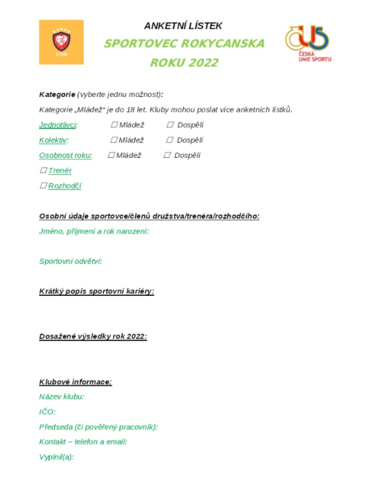 Sportovní a tělovýchovná organizace Rokycany, z.s. ve spolupráci s Českou unií sportu vyhlašuje anketu SPORTOVEC ROKU ROKYCANSKA 2022. Vyplněný anketní lístek zasílejte na e-mailovou adresu: referentka@storokycany.cz nebo na adresu: Jiráskova 214, Rokycany, 337 01 nejpozději do 15.3.2023.